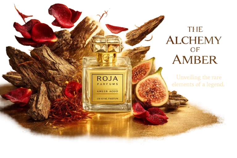 Experience the breathtaking warmth of amber aoud crystal by Roja Parfums, a colorless extrait de parfum that offers opulent luxury without staining.